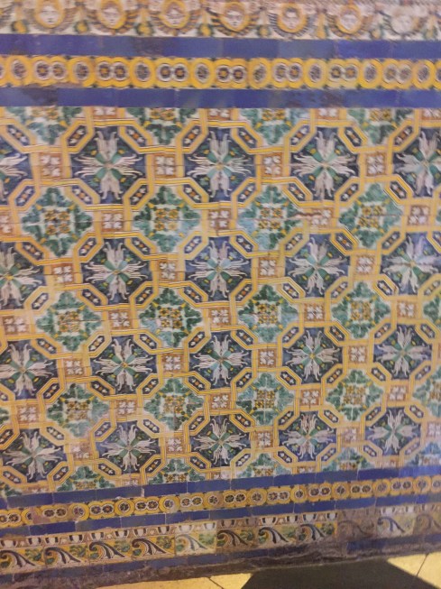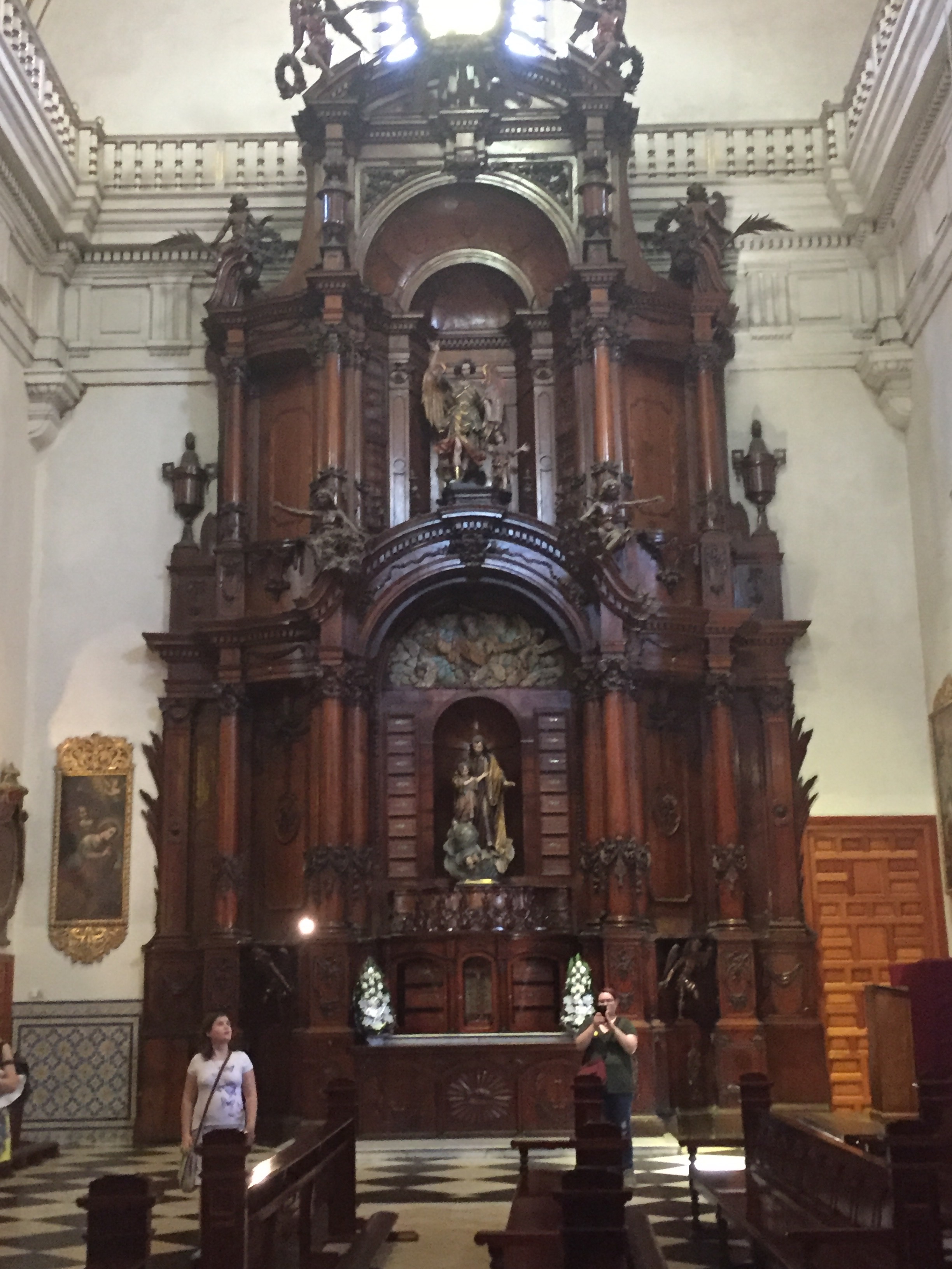 Next stop, San Pedro Church, which is not a museum, rather an active congregation. We saw people giving confession and praying. So a quiet exploration is important. We learned that this is the church the upper crust of Lima still uses for its weddings and baptisms. Inside is lovely with its gold painted arches, ceramic tiled walls and majestic wooden alters.