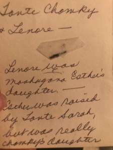 The photo is touching. It shows Chamka (Champy) holding Meshugganah Esther’s daughter, Lenore. And it tells part of the story on the back.