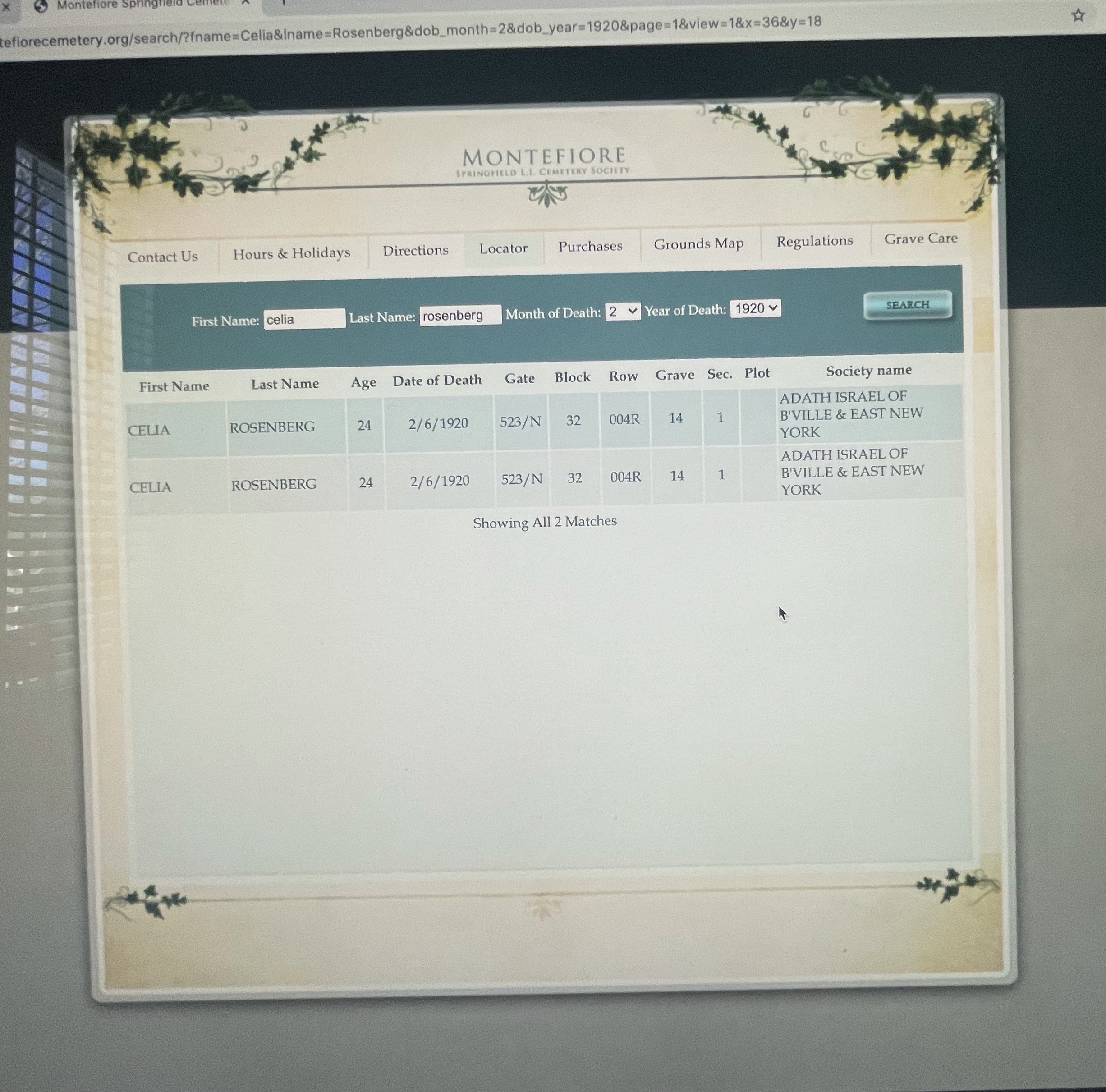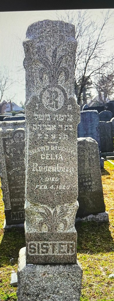 Celia is buried in the old Montefiore Cemetery in New York. She is in the Adath Israel of B’ville section. I do not think any other members of our family are buried there, or at least any that I have found so far. Most are buried in Washington Cemetery. The fact that she is there alone saddens me.