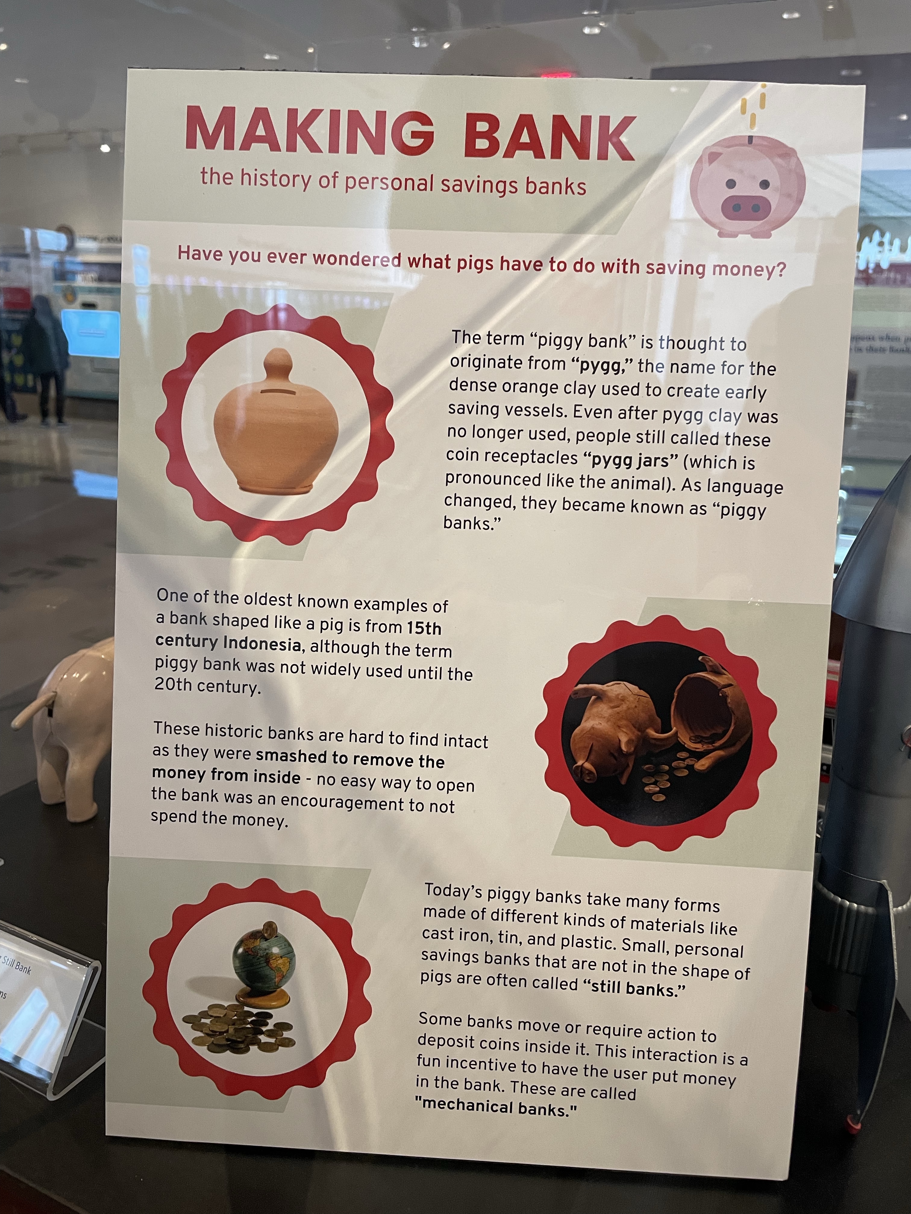 Walking along the coin wall leads you straight to the museum. There were little stations set up for the guests to learn fun facts about money, finance and how the federal reserve system works. One display had counterfeit money and explained the safety mechanisms to check to see if bills are real. Another explains the history of piggy banks. There are fun facts on boards called “Jay’s Journal” directed toward children.