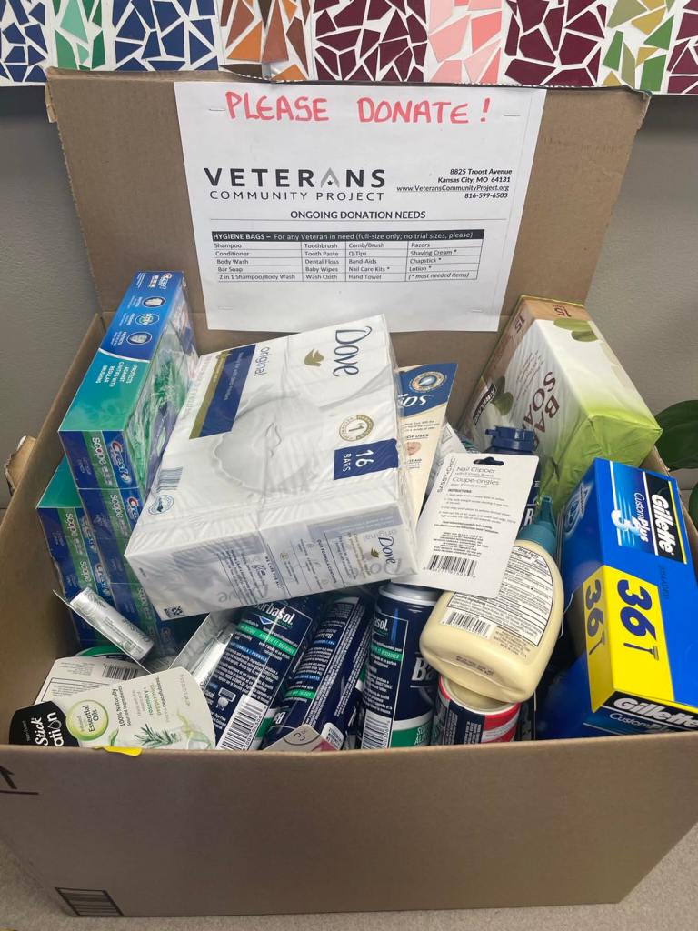 The last community service was one of my favorites. I made contact with the Veteran’s Community Project (VCP) for our school to help them this year. The wonderful Kristin Griffin, a VCP staff member, came to speak to our students. The student council had decided to up our collections and collected almost 250 pairs of socks before the talk in January 2023. So when Kirsten came to talk, we gave her the socks. Later in the year, during the month of February we collected hygiene products for the VCP.
