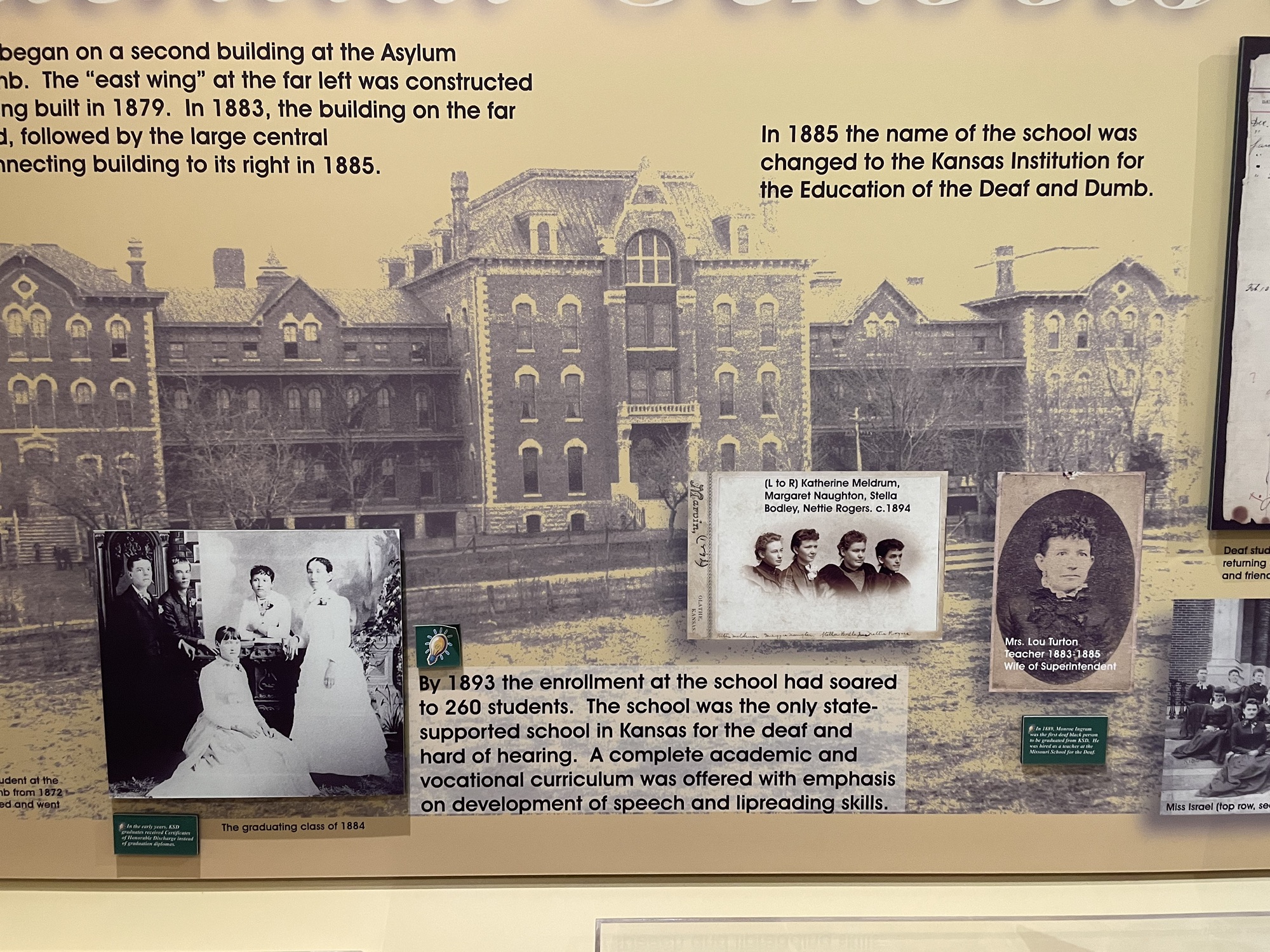 The school was established in 1861 as the Kansas Deaf-Mute Institute. Its’ name changed over the years, using words we no longer use to describe it. It received its’ current name in the early 1900s. The school serves Kansas children starting at age 3 and continuing through age 21. Its mission is: “To ensure that all students we serve achieve their full potential in a language-rich environment.”