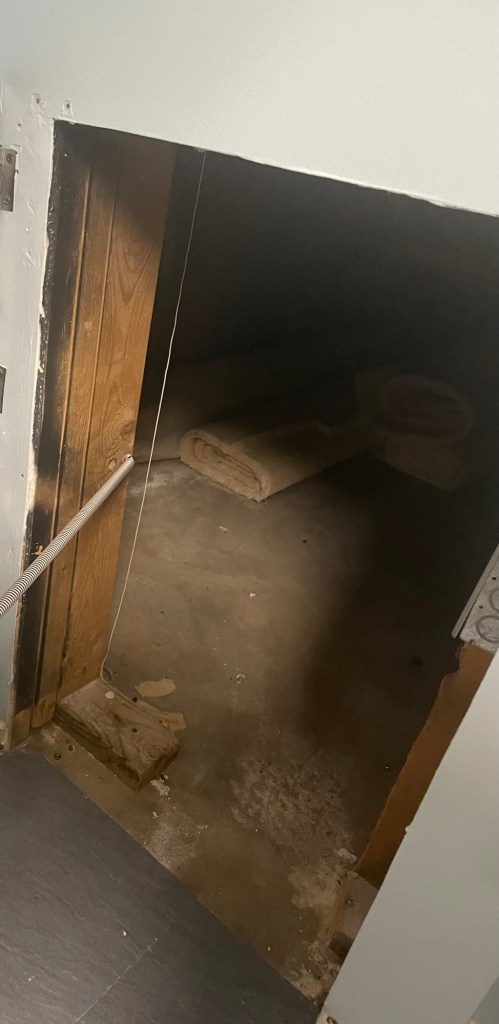 But he did not have to unscrew anything. That air conditioner vent was hinged and held closed by a spring. When he opened this ‘door’, there was a crawl space with access to all the pipes. There was even a light switch and a working light.