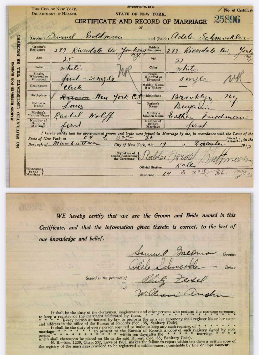 I knew he was married at least two times. He married his first wife, Adele, in 1932, when he was in his 20s. They had one daughter, Vesta. (Thanks to her unusual name, it is easy to find him!) I never knew Adele, although I did meet Vesta once or twice. She was 20 years older than me. When I knew Uncle Sammy, he was married to Sylvia, who I assumed was his second wife.