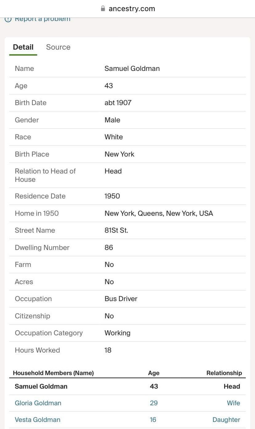 When he was 43 years old, in the 1950 census, he had a wife named Gloria who was 14 years younger, jsut 29. His then 16-year-old daughter was living with them. But this entry in the 1950 census is important because it confirms that he was a bus driver.