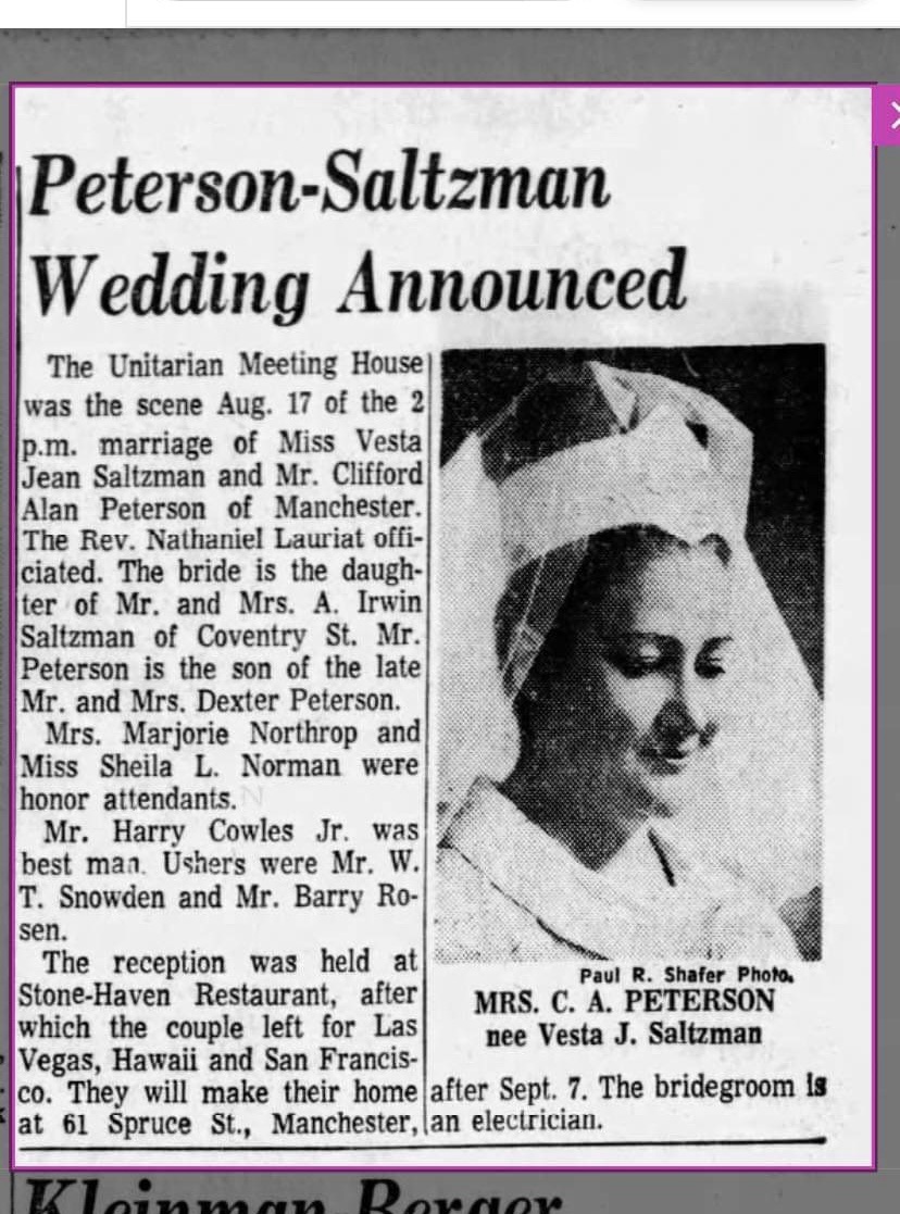 EW did find one more item for me. Uncle Sammy’s daughter, Vesta Jean got married in 1969. He told me that she is listed as Vesta Goldman on her marriage license But as you can see here, in the announcements she took her stepfather’s last name, Saltzman.