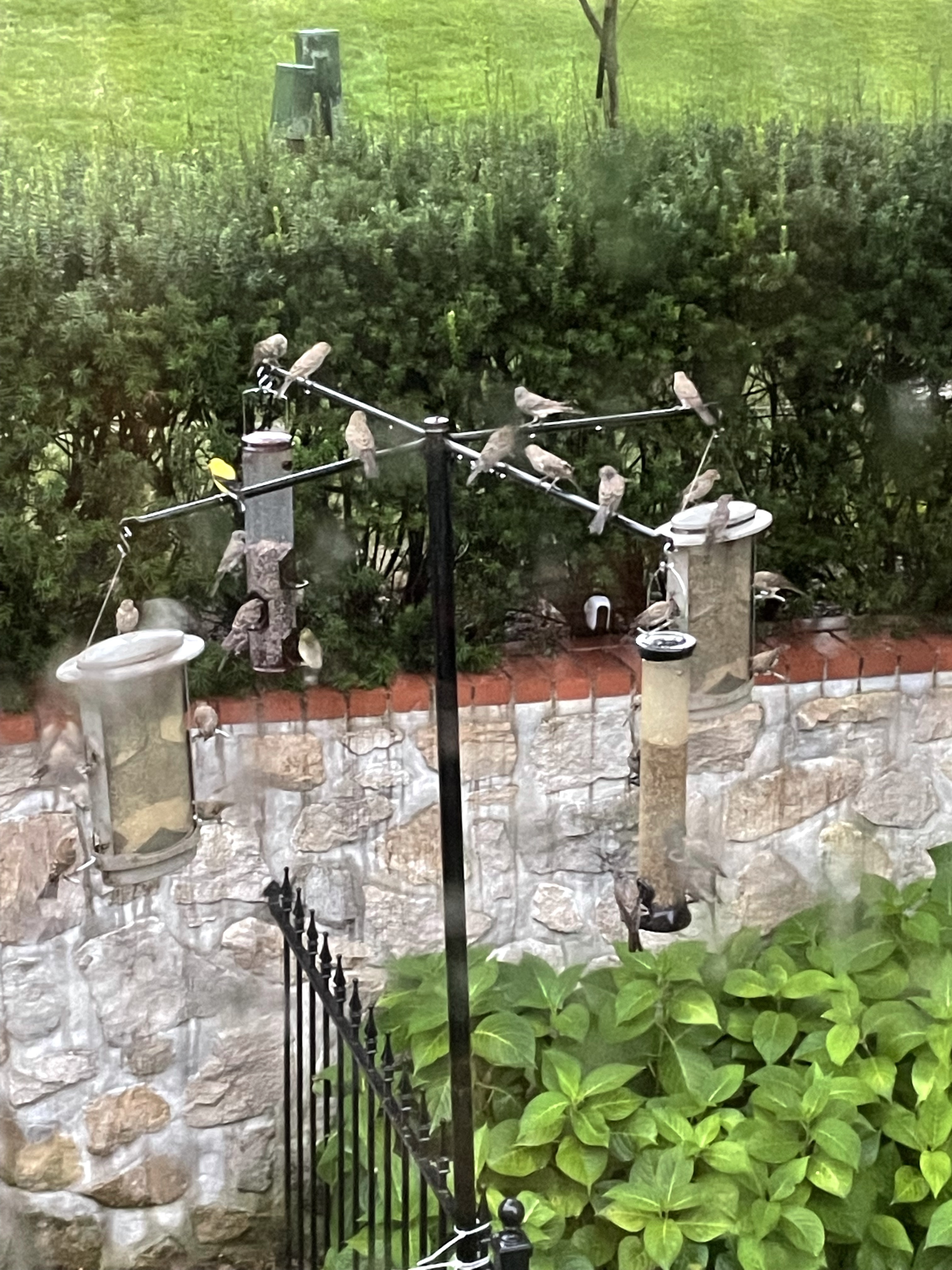 We have had turkeys and mourning doves and chipmunks happily munching on the seeds that fall to the ground. We see chickadees, finches of all colors, Blue Jays, cardinals, woodpeckers, robins, swallows, and a multitude of other birds gathering on the feeders, many times waiting their turn to eat. We buy bird food in 30-pound bags, several at a time. And yes, we do have a hummingbird feeder as well, which we recently moved.