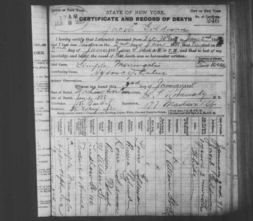 Jacob died when he was just over one year old on January 2, 1898, at 4 pm in the afternoon, with the document registered on January 3 (or 8). He was acutely ill for four days, with the doctor making house calls from December 30 until Jacob died on the second.