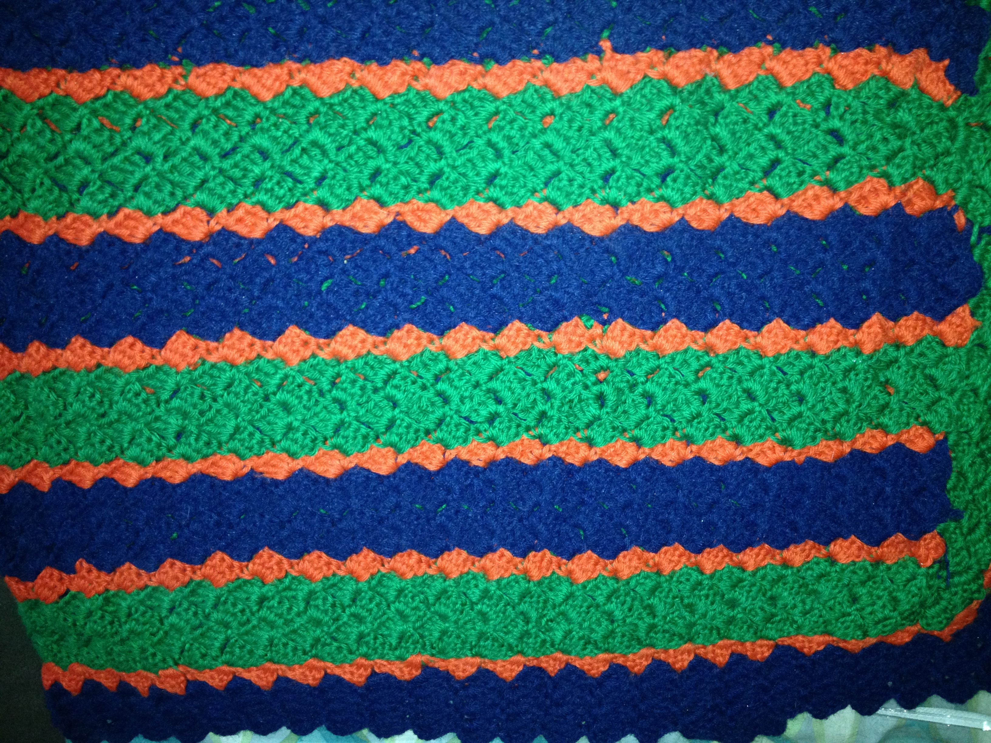 A dark blue, kelly green and orange afghan was made for my son.  By this time Grandma has having trouble.  My son was born when Grandma was 92. Grandma had three great grandchildren born close together that year.  If I remember correctly, my Aunt helped Grandma complete these afghans.   She had several more to make after my son was born.  I think his is one of the last full-size afghan.  She made a matching pillow to go with it as well.