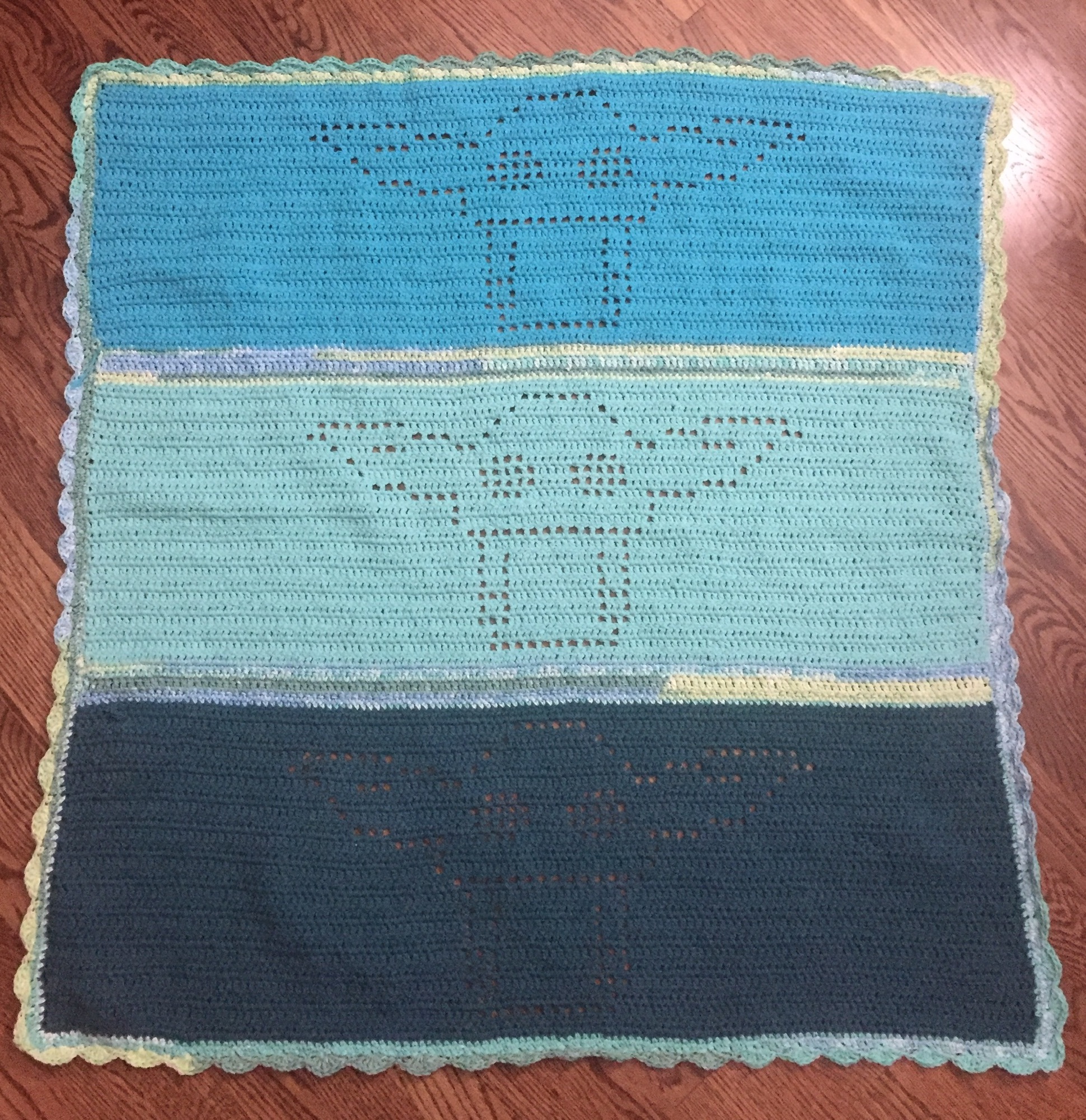 Another mom wanted blues and tan. Since she lived near a beach I went for a beach theme. Here you can see both the yarn and the finished blanket.