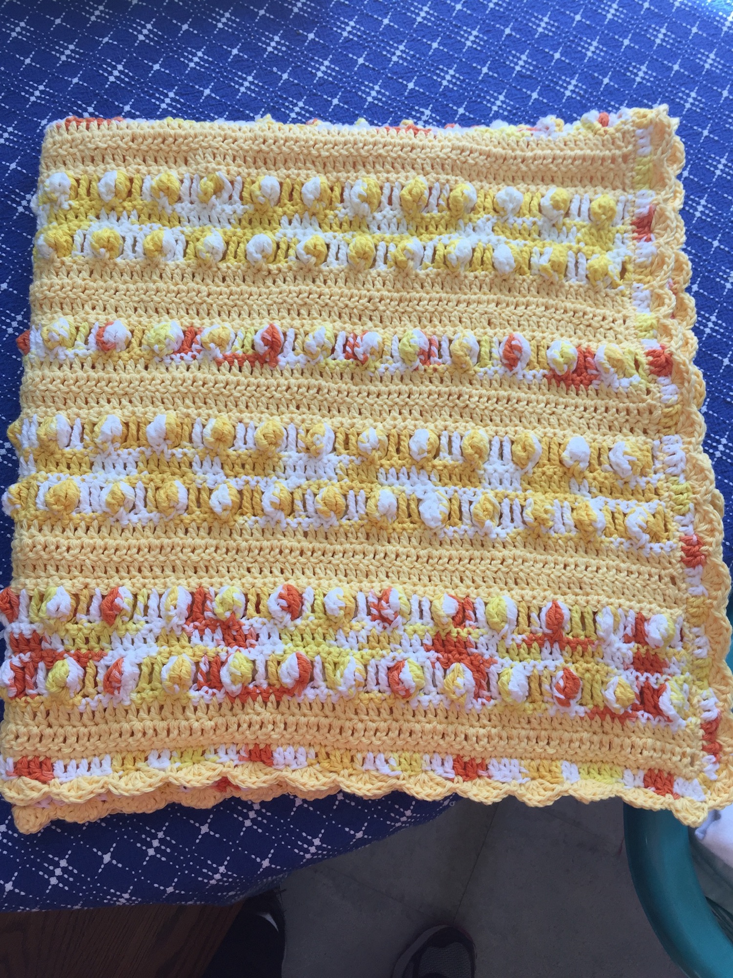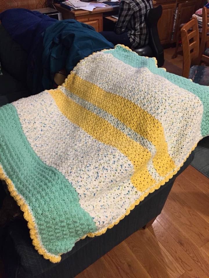 Sometimes I make a decision on the blanket not based on what the mother might want, but what I think they need. One of my best friend’s daughter loves only black, grey and white. I was NOT going to make a blanket for a baby girl in those colors. Instead I made a yellow and orange cheerful blanket. That girl is now a bright and cheerful 4-year-old. The blanket matches her personality.