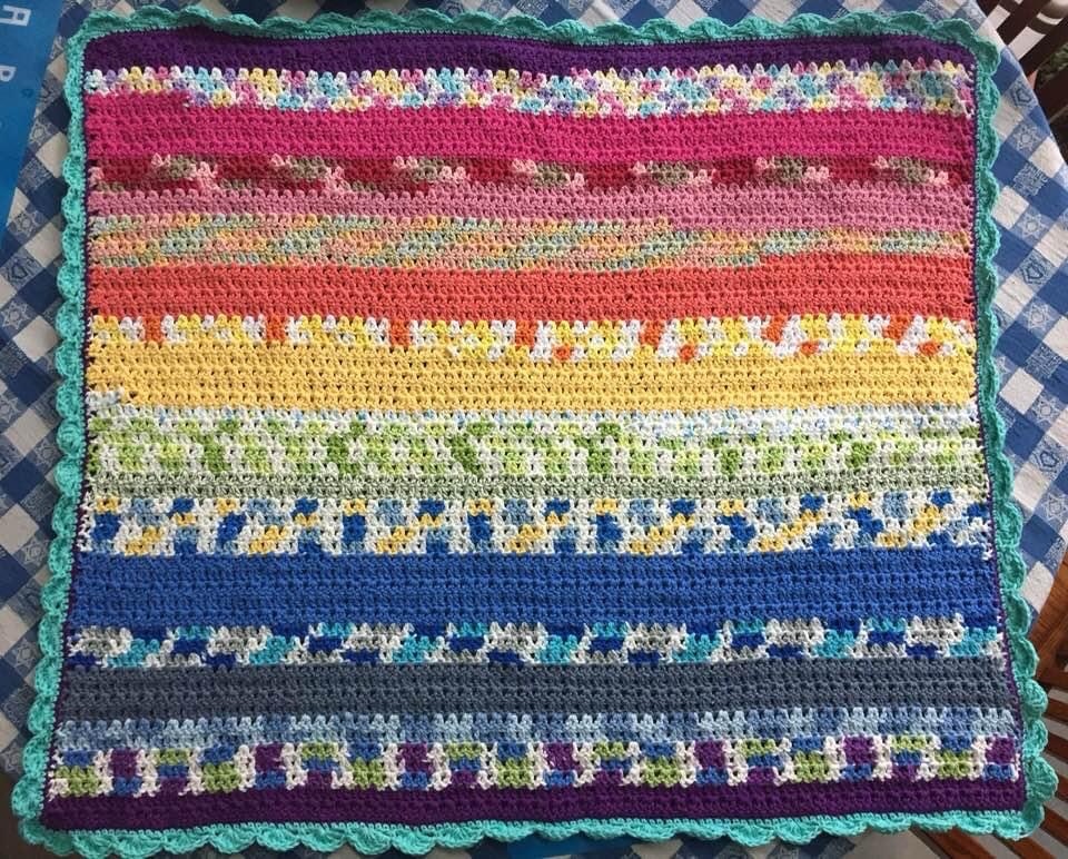 One of my favorites was for a cousin’s grandson. The mother wanted a gender neutral blanket. I took all my scraps and made a rainbow blanket. I love that one. There might be another rainbow blanket one day.