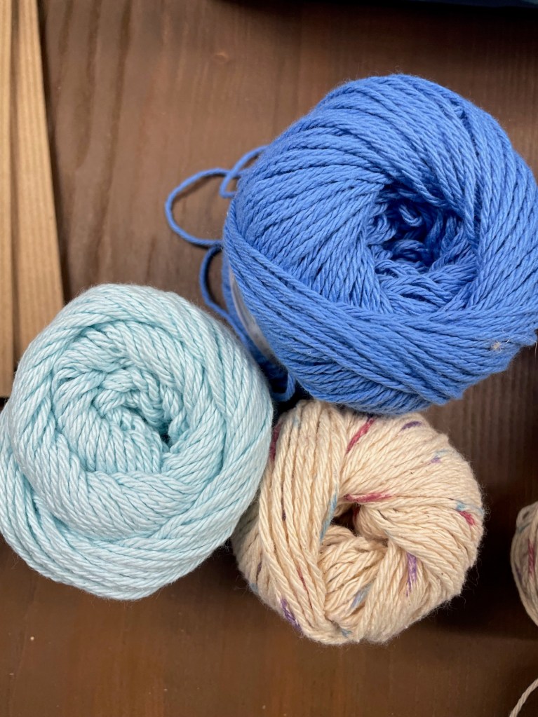 Now I have to select the yarn. I always use a cotton yarn. My favorites are Sugar and Cream, which I can get at Joann’s or Michaels craft stores. The other one is sold only at Michaels, Creme Cotton.. The color combinations determine the yarn in many cases. One of the yarns only come in five or six colors. The other yarn has a larger selection and variegated yarns.